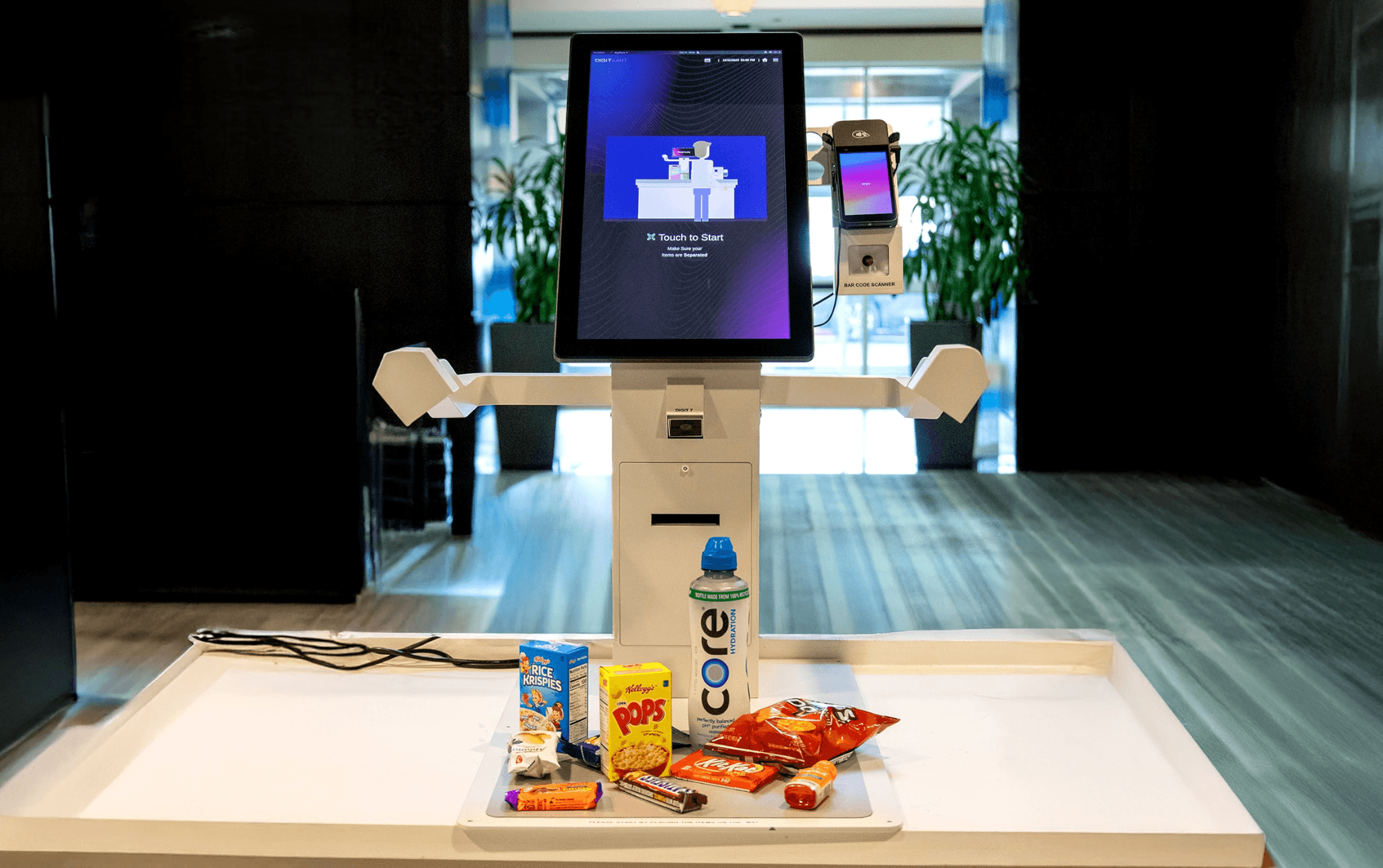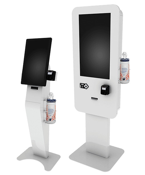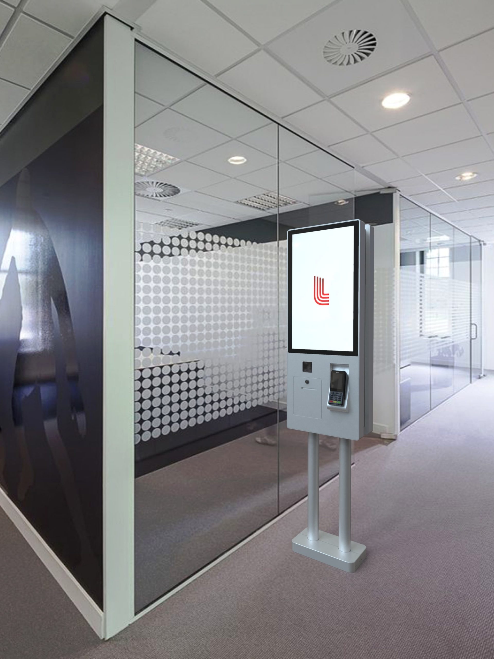 Discover our sleek, modern self-service kiosk, perfectly integrated into contemporary office environments. Featuring a vibrant touchscreen display.